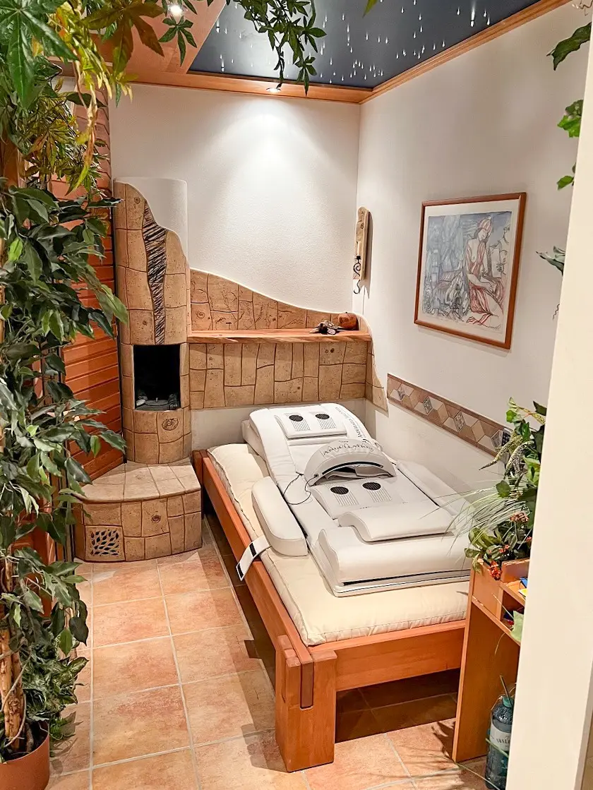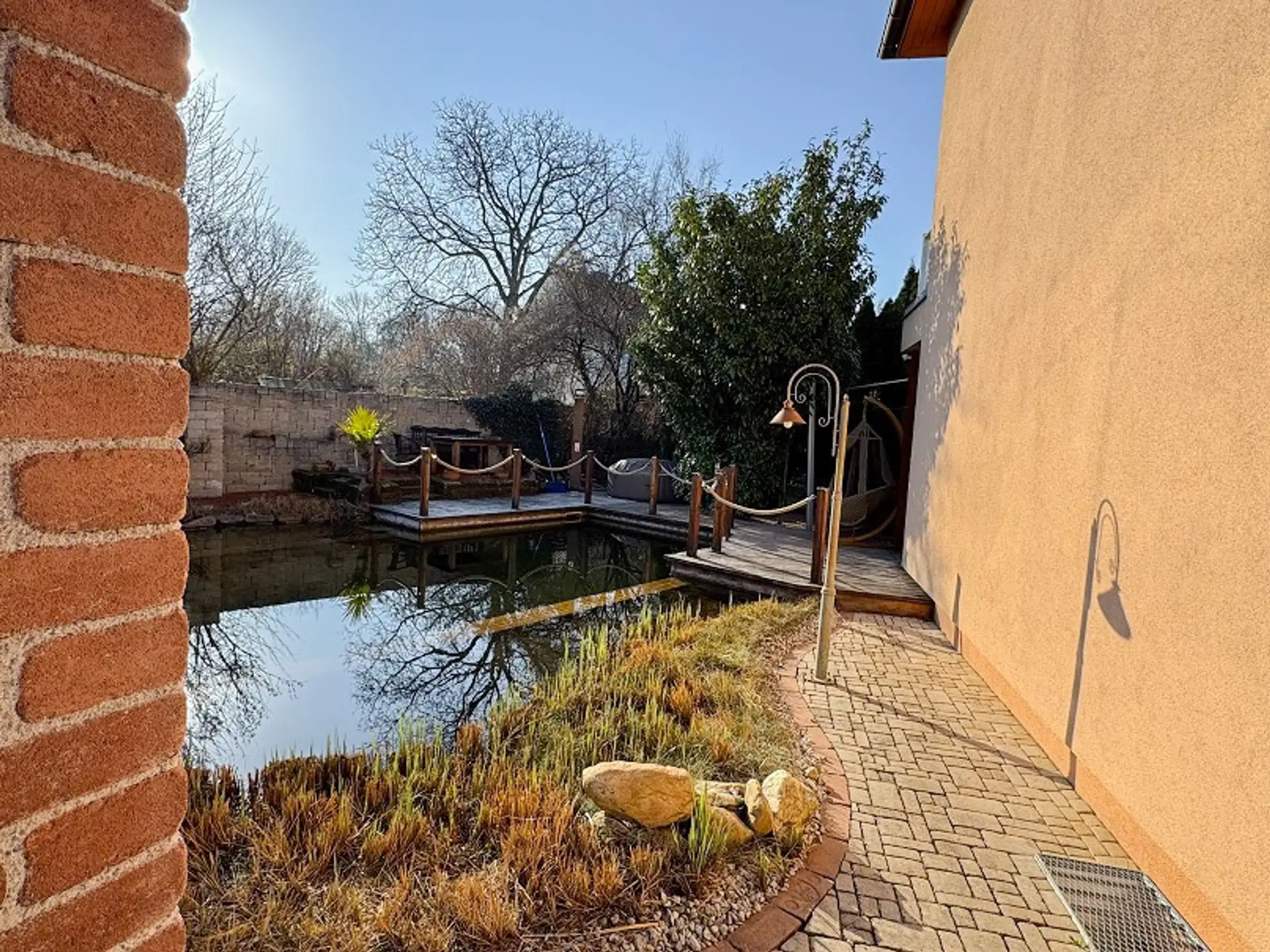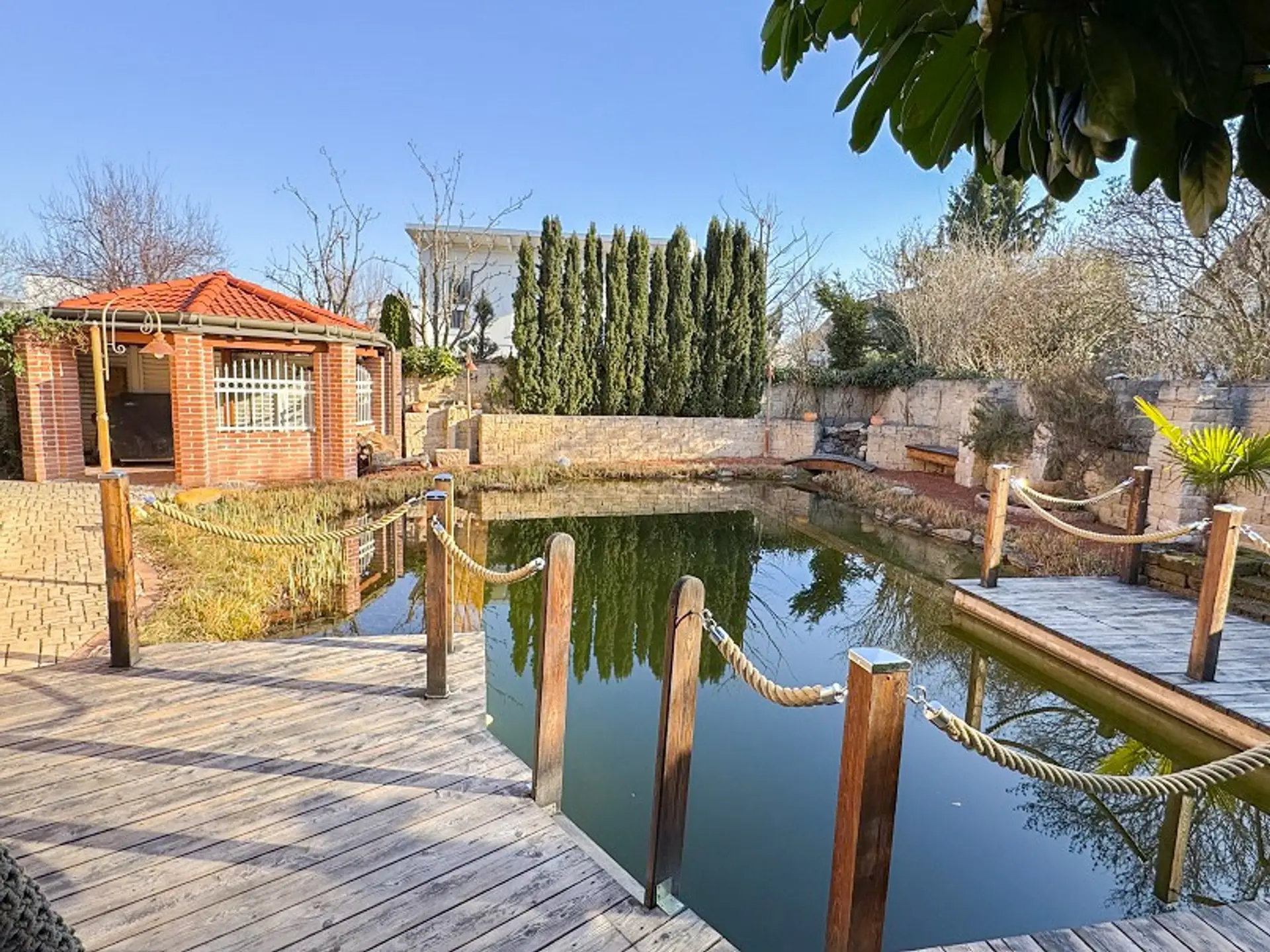Natur-Schwimmteich, automatisiert mit Fernbedienung bzw. Zeitschaltuhr und Pegelsteuerung, Überlauf in den Kanal, kleiner Strandbereich für Kinder, Karbonisator, Skimmer, Wasserfall mit Bachlauf und Brücke sowie zusätzlichem Quellfluss. Das Schwimmbecken misst 9x4 m und hat eine Tiefe von 2,2m, Marmorspringbrunnen, mehrere Sitzbereiche um den Teich.