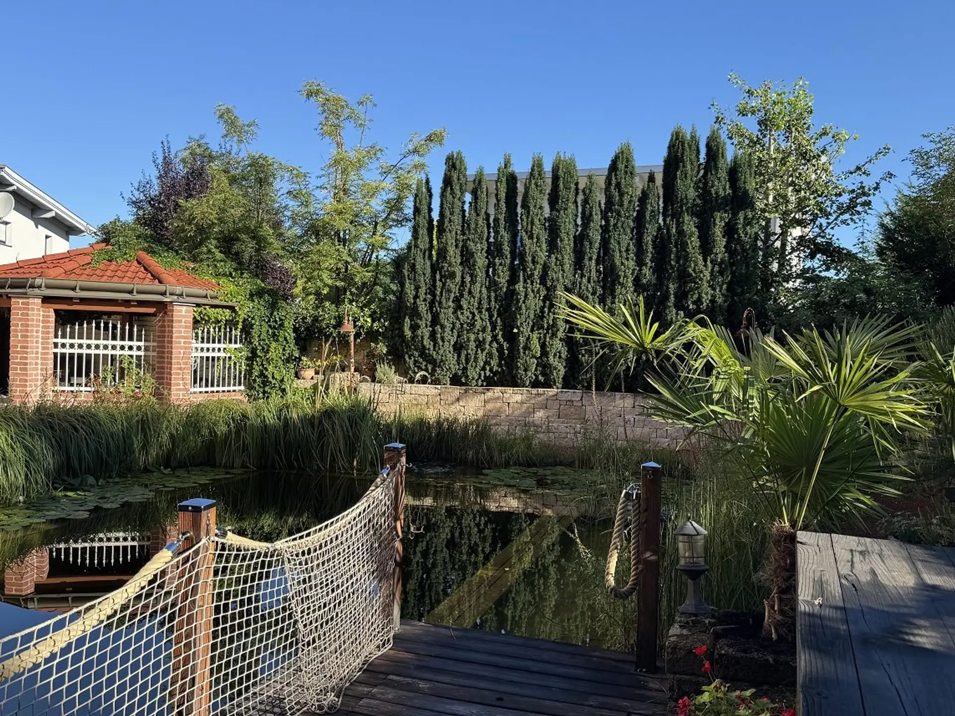 Natur-Schwimmteich, automatisiert mit Fernbedienung bzw. Zeitschaltuhr und Pegelsteuerung, Überlauf in den Kanal, kleiner Strandbereich für Kinder, Karbonisator, Skimmer, Wasserfall mit Bachlauf und Brücke sowie zusätzlichem Quellfluss. Das Schwimmbecken misst 9x4 m und hat eine Tiefe von 2,2m, Marmorspringbrunnen, mehrere Sitzbereiche um den Teich.