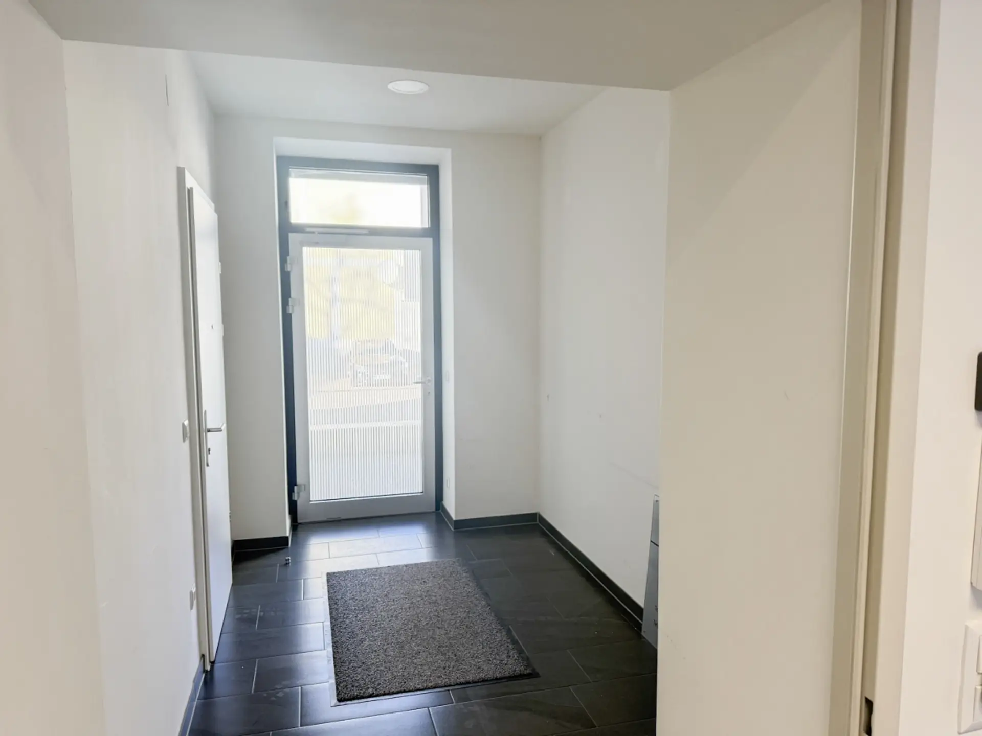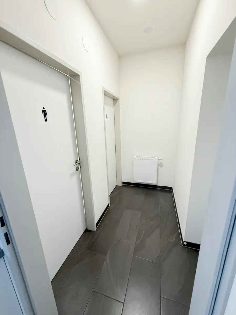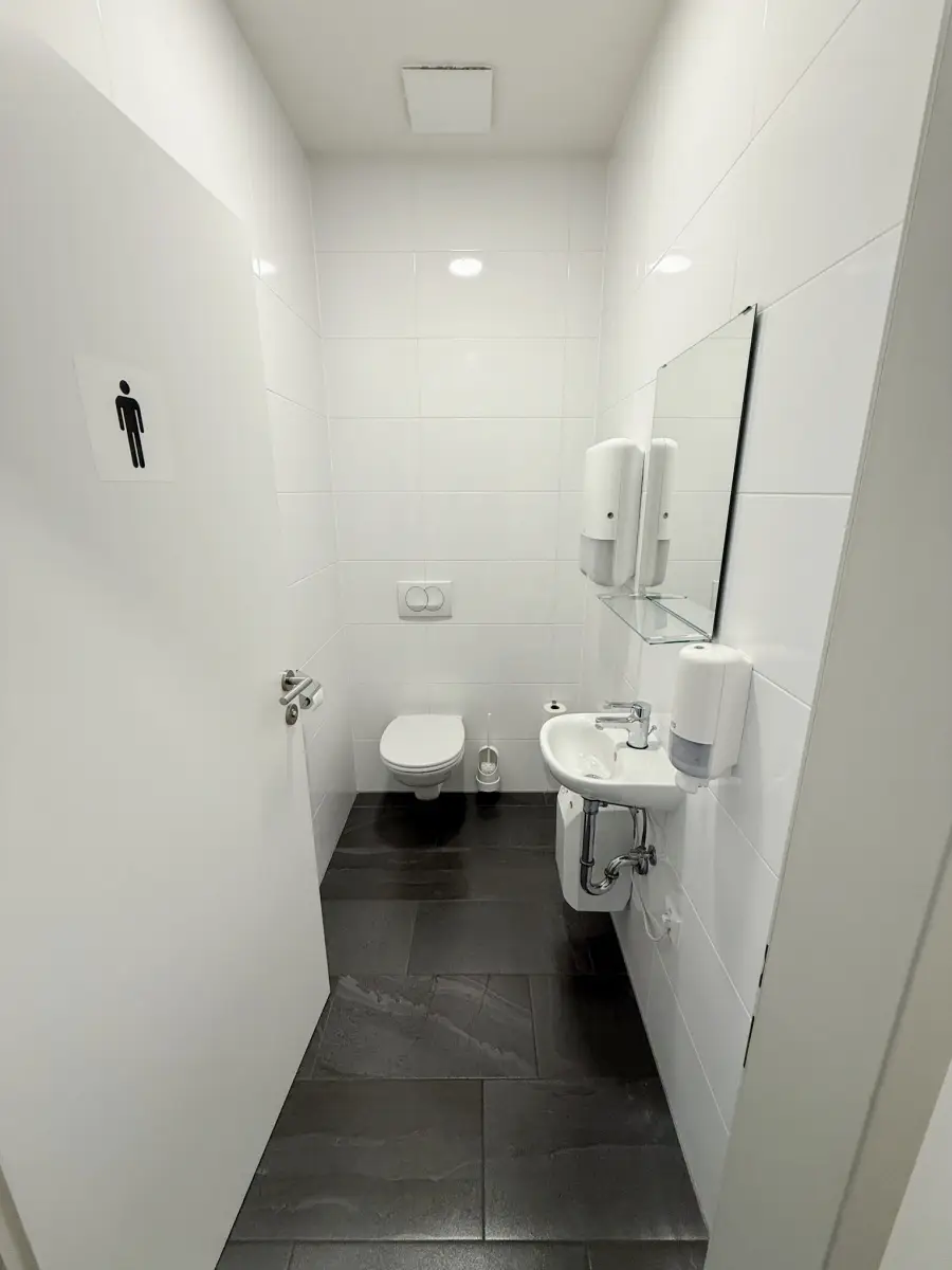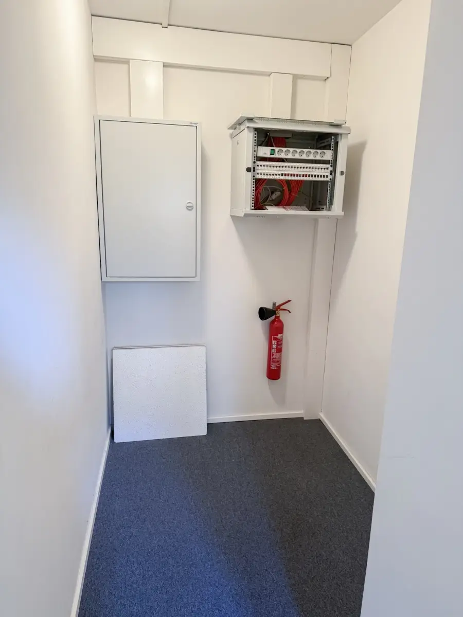 Ein Zimmer ist derzeit ein Aufenthaltsraum mit Küchenzeile, Vorraum mit 2 getrennten WCs, ein weiterer Vorraum mit Zugang zu 2 hellen Büros, ein Abstellraum und ein Technikraum (Server).