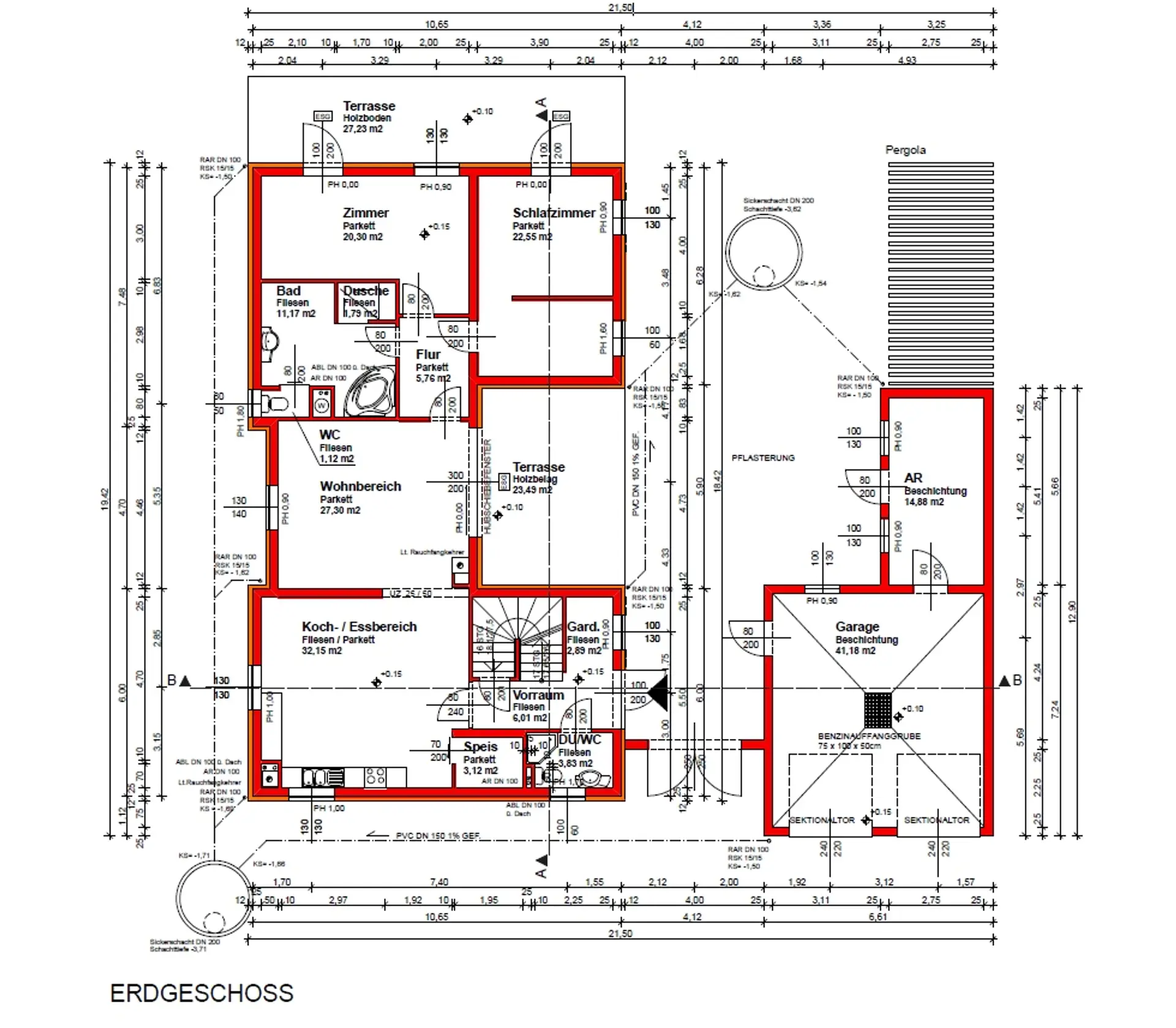 Erdgeschoss: Der helle Wohn-Essbereich mit Kachelofen bildet das Herzstück des Hauses. Die moderne Einbauküche mit Speis-Vorratskammer ist direkt angeschlossen und lässt jeden Hobbykoch happy sein. Zwei Schlafzimmer – eines davon mit Ankleide –ein Badezimmer, ein Vorraum und ein Gäste-WC ergänzen diese Ebene. Von hier aus gelangt man auf zwei Terrassen, die den Wohnraum nach draußen in den Garten erweitern.