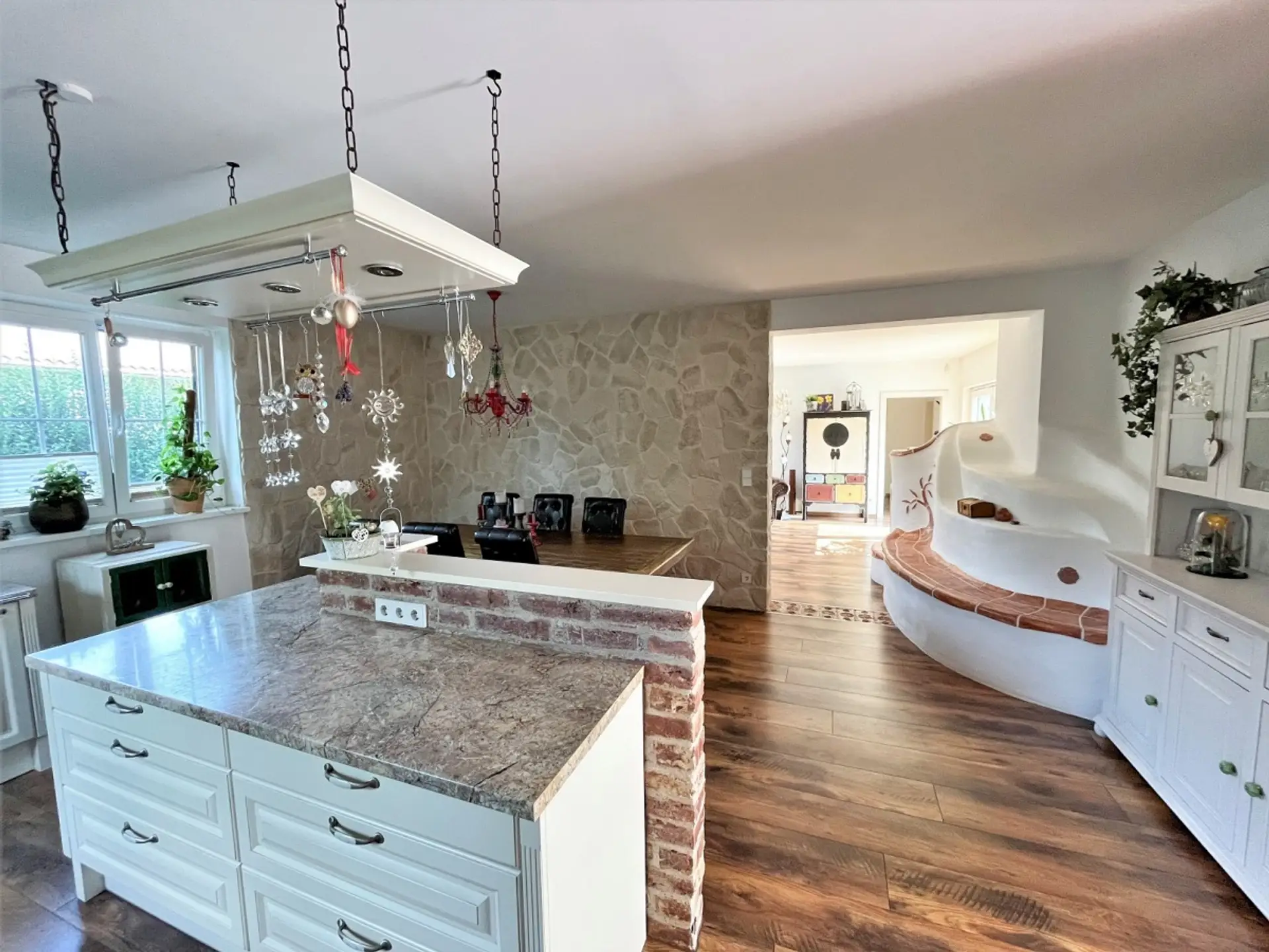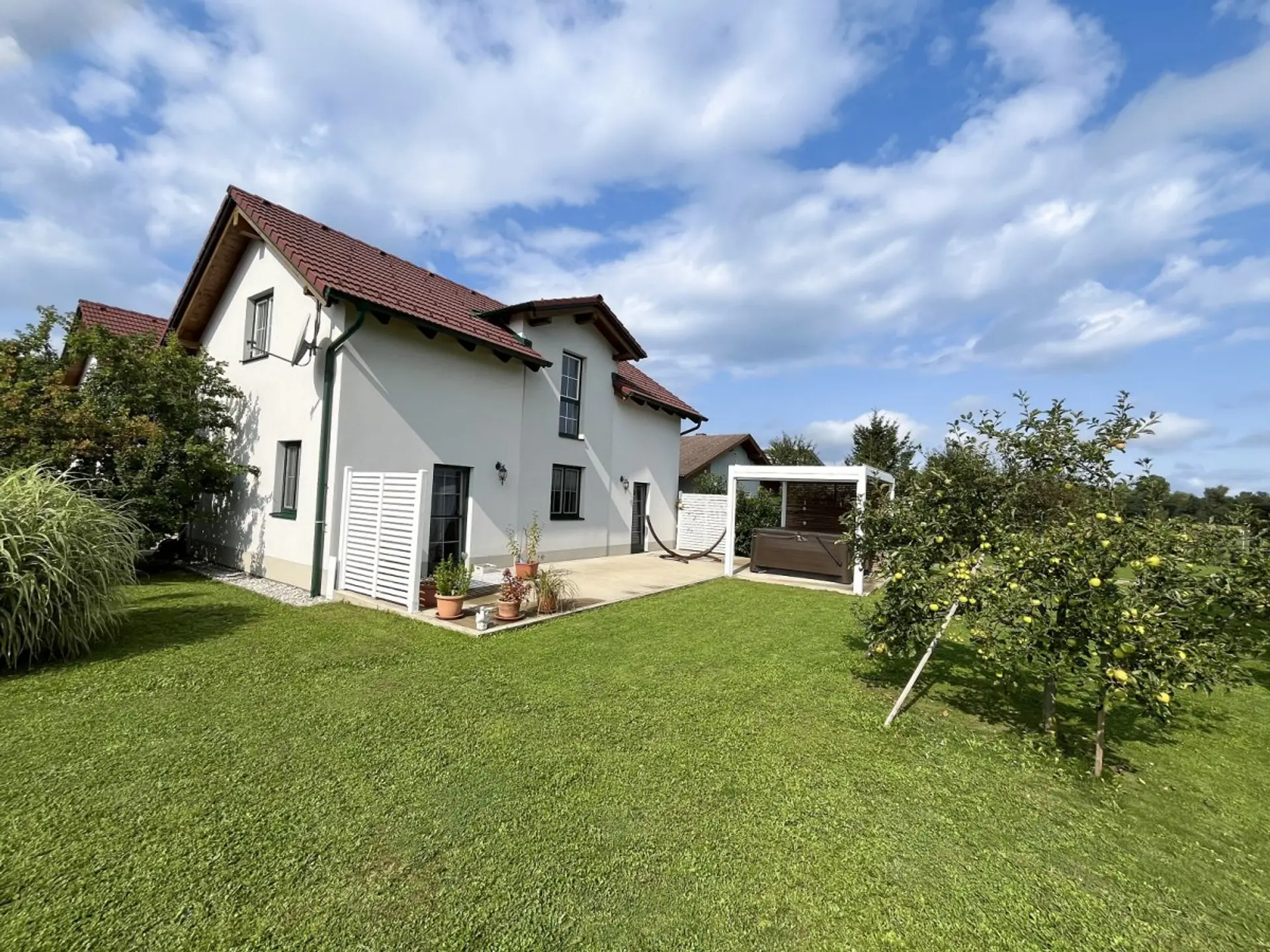 Die Ausstattung ist hochwertig: Kunststofffenster, Alarmanlage, maßgefertigte Tischlerarbeiten, eine moderne DAN-Küche mit Markengeräten sowie ein Kachelofen mit Abbrand Automatik prägen den Wohnstil. Für Effizienz und Komfort sorgen eine Wasser-Wasser-Wärmepumpe mit Brunnenanlage, die 2024 installierte Photovoltaikanlage (15 kWp), eine neue Hebeanlage im Keller sowie eine Grander-Wasserbelebung.