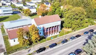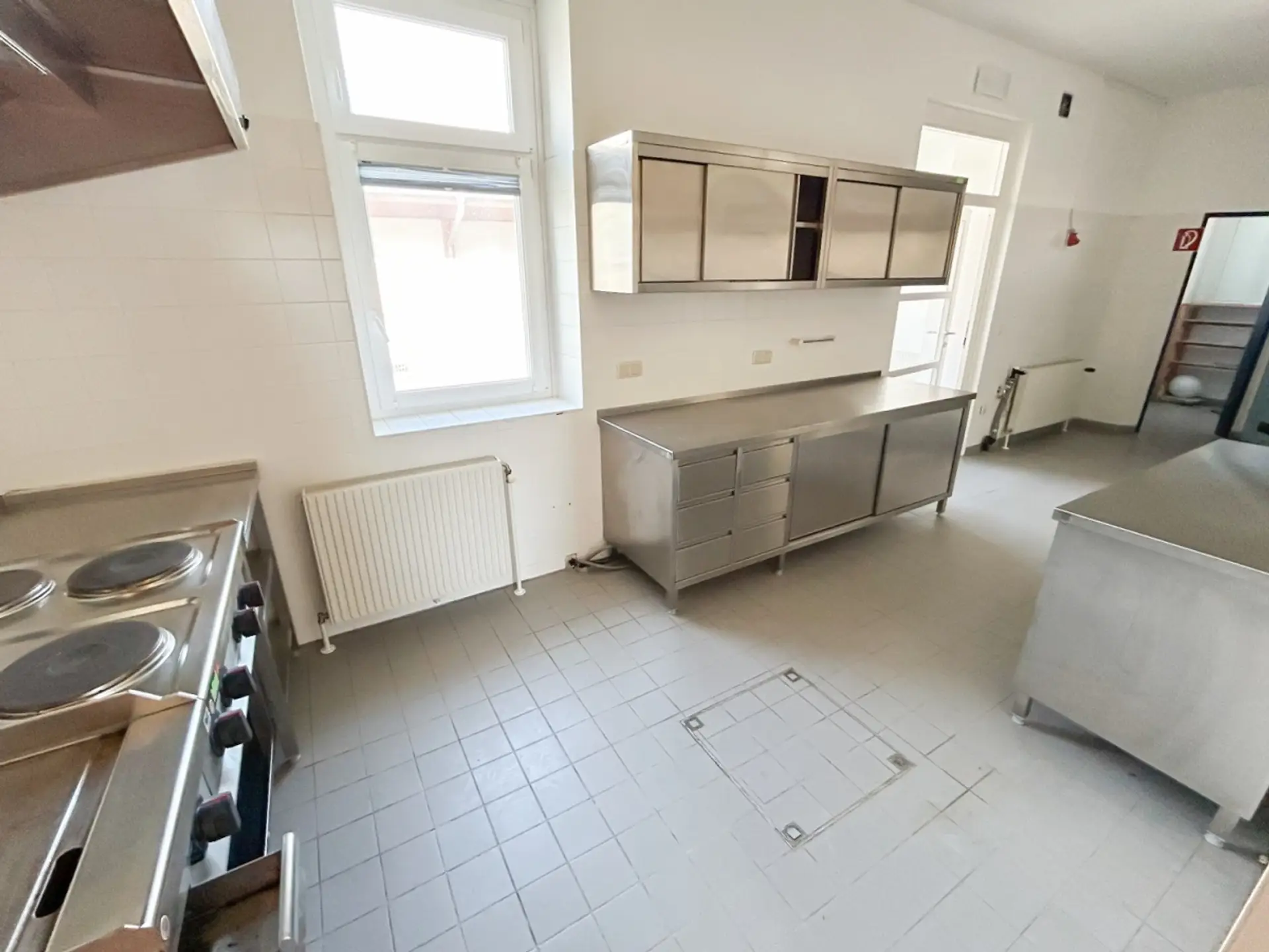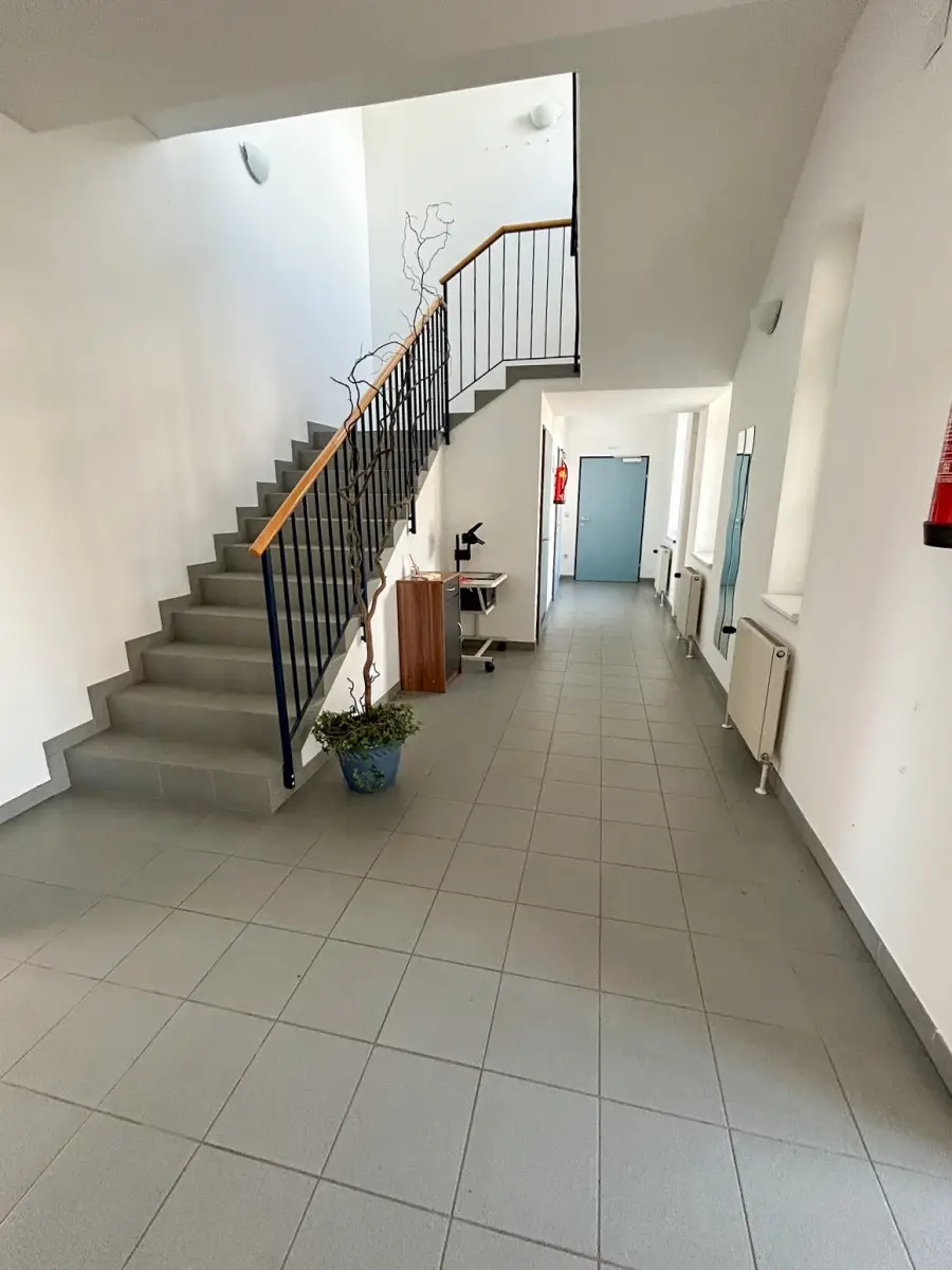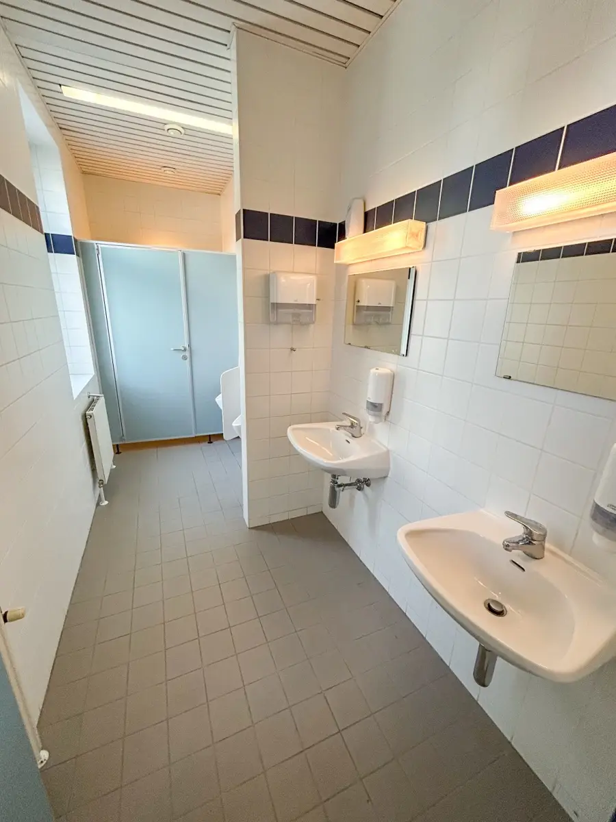 Das Erd- und Obergeschoß ist jeweils in 4 helle Räume, wobei einige davon getrennt werden können, geteilt. Außerdem sind ausreichend WCs (8) für Damen und Herrn und ein Badezimmer vorhanden. Im Erdgeschoß liegt eine gut ausgestattete Küche mit Aufenthaltsbereich und eigenem, barrierefreiem Eingang, wobei dieser direkt an die Berufsschule Theresienfeld grenzt. Das Obergeschoß ist nicht barrierefrei.