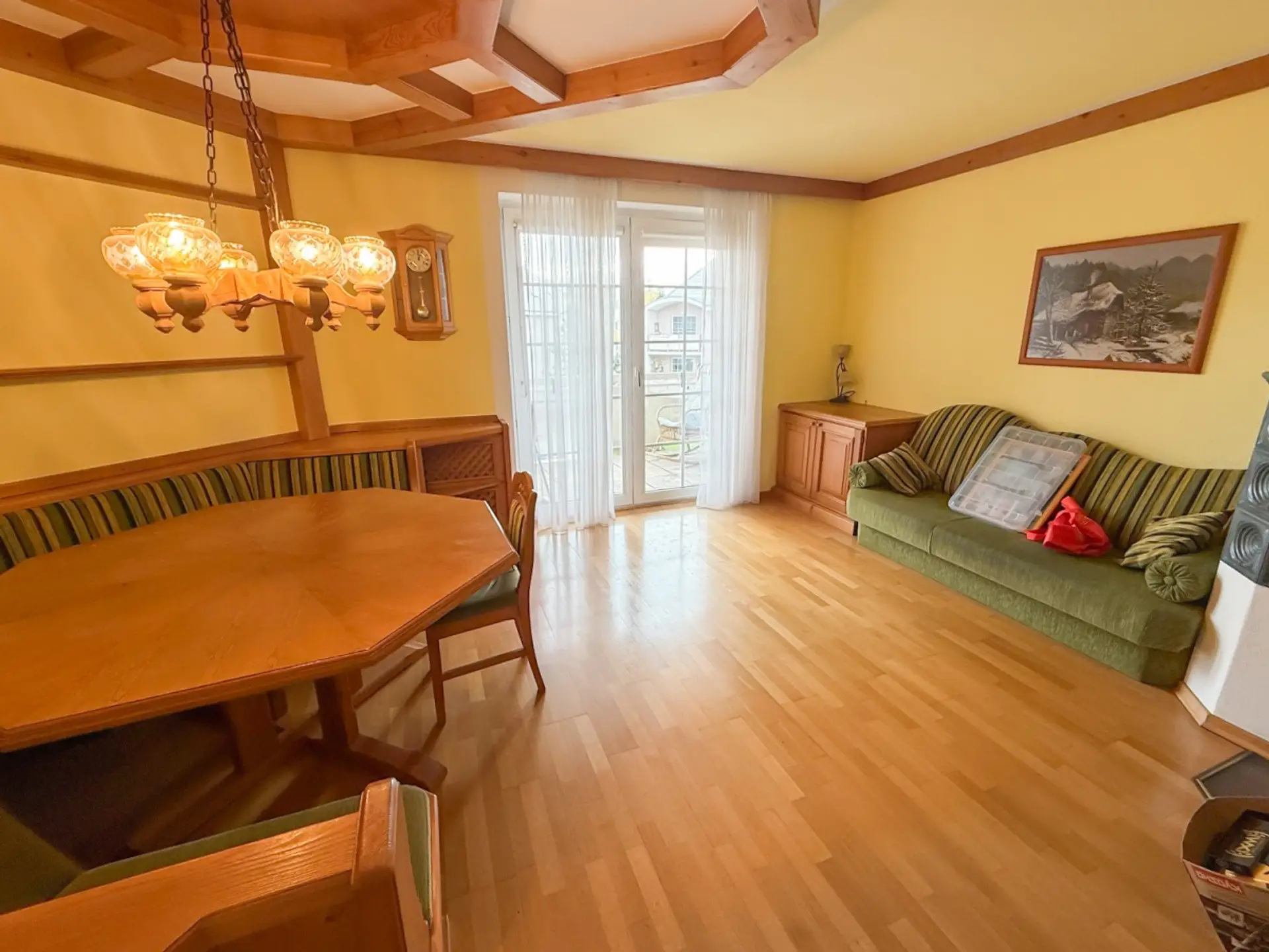 -Wohnzimmer mit gemütlichem Esstisch und Kachelofen; Ausgang auf die Loggia