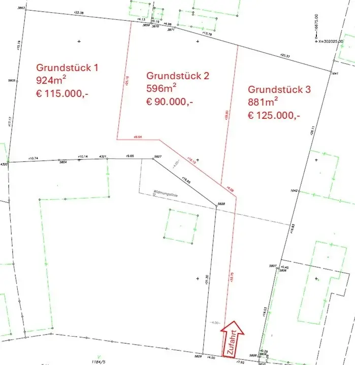 • Grundstück 1: 924 m² um 115.000,- (Zufahrt muss dem Grundstück 2 gewährt werden) (Aufschließungskosten € 11.866,02)