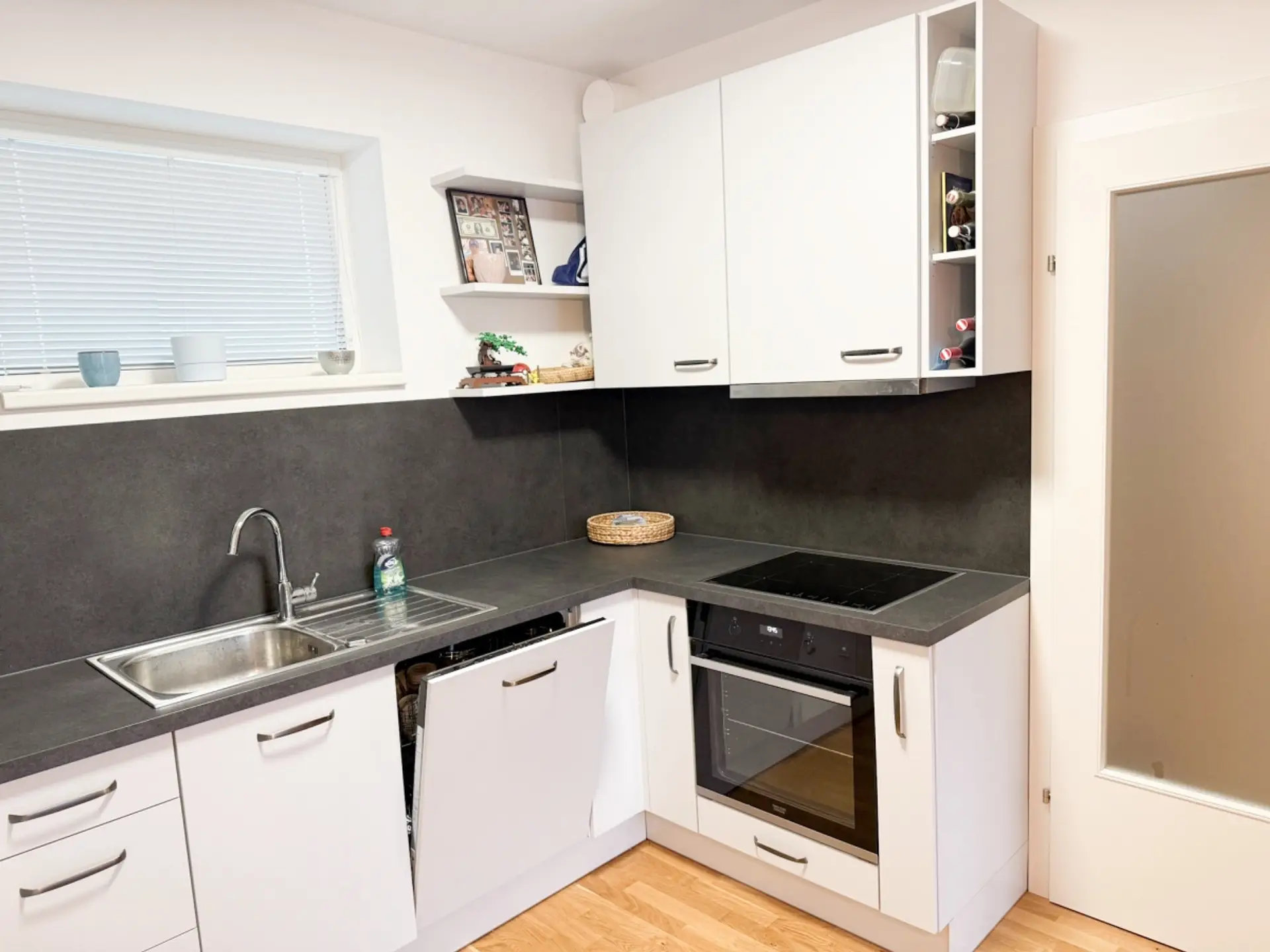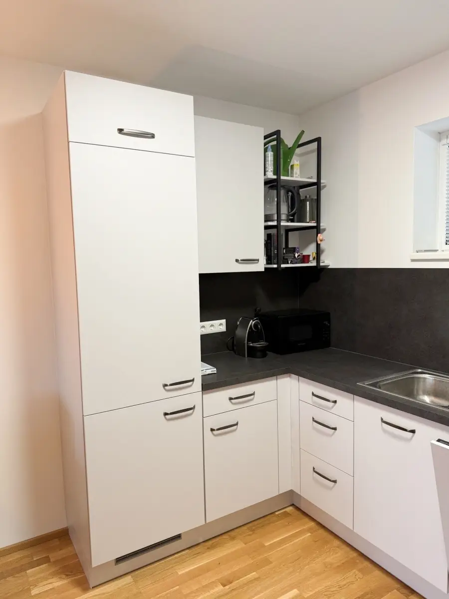 Für die 2,5 Jahre alte Küche wird eine Ablöse von € 5.500,- verlangt. Sie ist mit Herd (Induktion), Backrohr, Kühl-/Gefrierschrank, Geschirrspüler, Spüle ausgestattet.