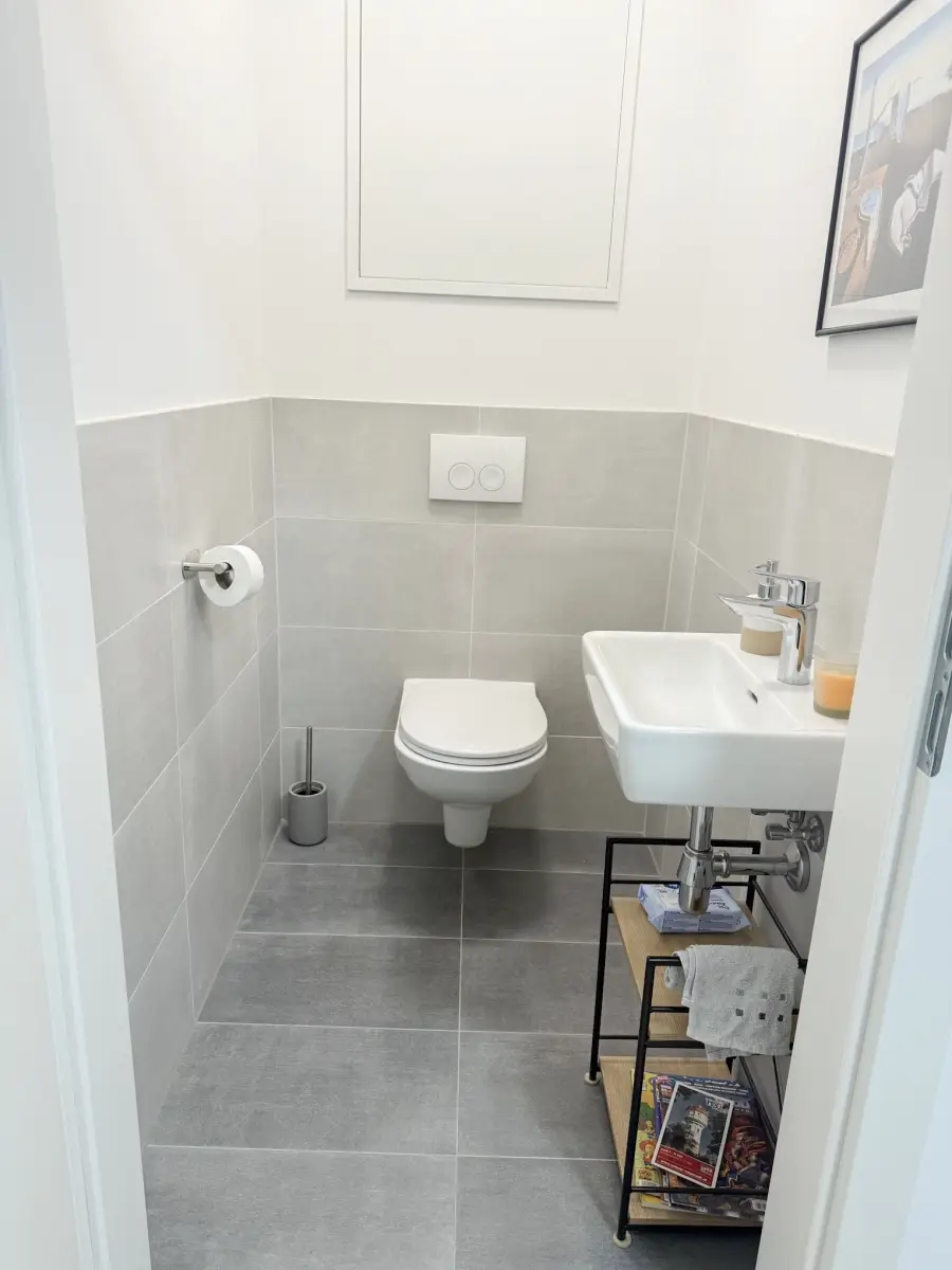 Einrichtung: Grundausstattung aus Sanitär und Fliesen, Parkett.
