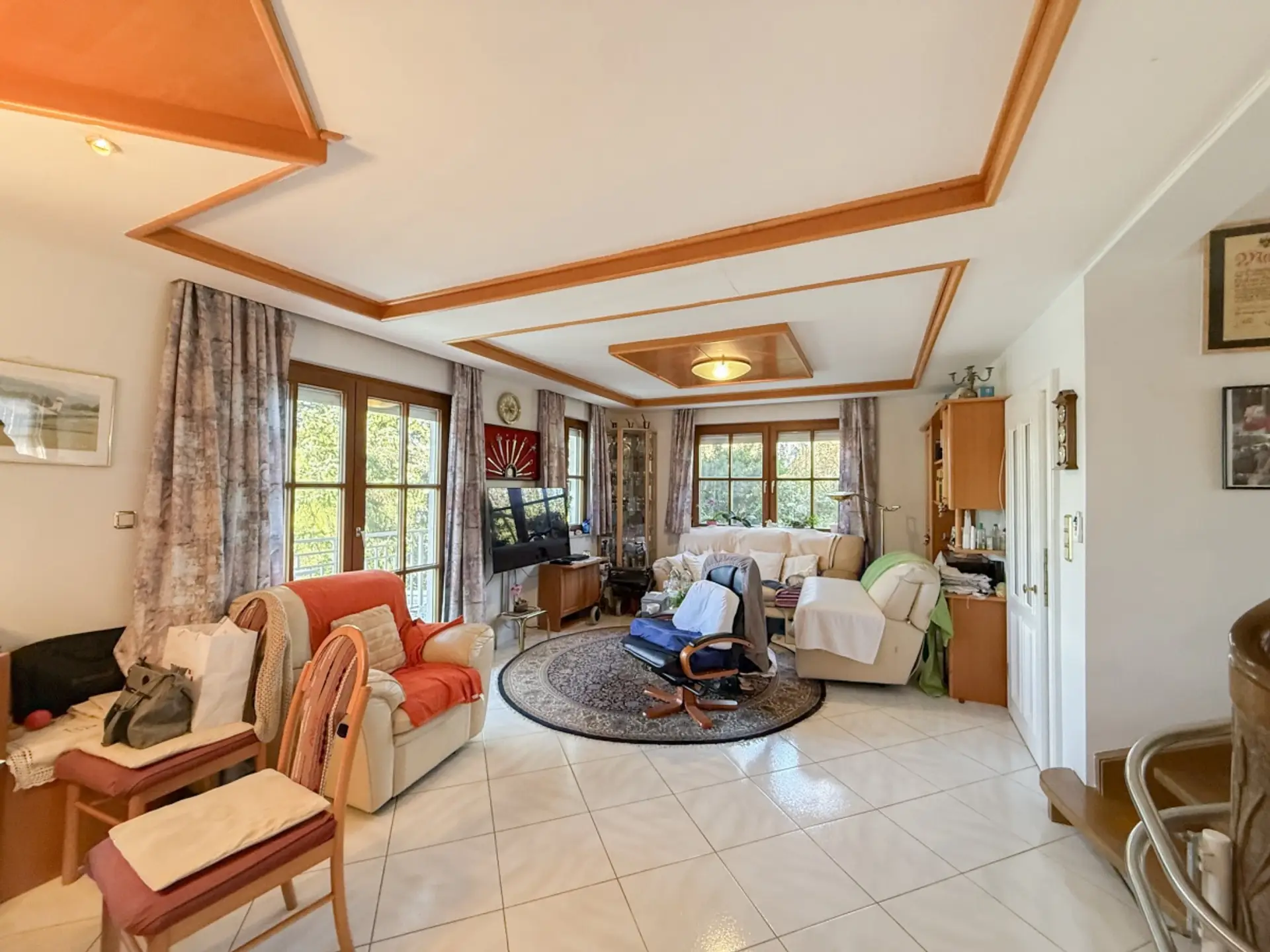 Die Fußböden sind mit Fliesen und Parkett belegt, die Fenster haben Außenrollläden und Fliegengitter.